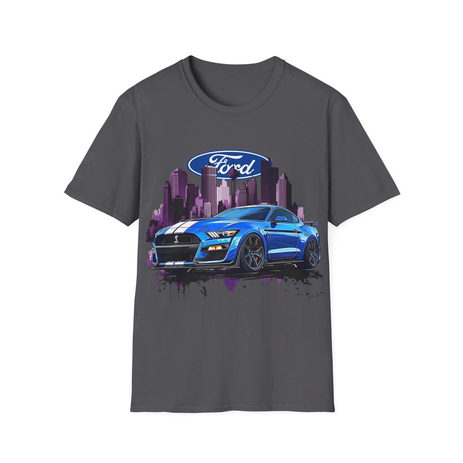 Ford Mustang Graphic T-Shirt — Blue Muscle Car Cityscape Tee